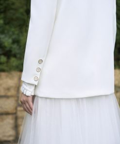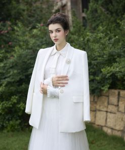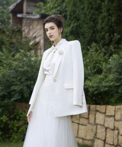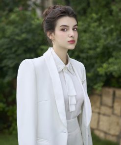 – Áo vest: phom vest suông hiện đại,nữ tính.Sử dụng chất liệu tuytsy Hàn,ve áo phối bóng sang trọng.Cài đá trang trí ve aos vest.