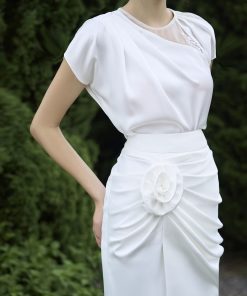 – Chân váy phom bút chì suông xếp ly đổ 2 bên em hông che khuyết điểm bụng tuyệt đối, chi tiết đính nhẹ ở áo kết hợp tạo dáng hoa 3D đính lệch hông là điểm nhấn đắt giá của Kate Set