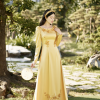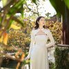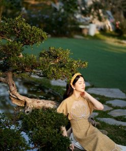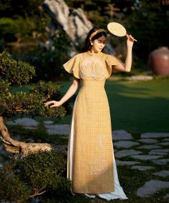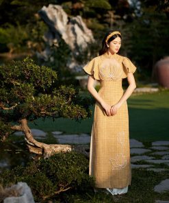 Sử dụng chất liệu tweed đầy mới mẻ trên nền màu sắc vàng ánh dương nổi bật, cùng với kĩ thuật đính kết ngọc trai tạo hình hoa sen truyền thống nổi bật đã tạo nên vẻ đẹp độc đáo của áo dài Thiên Ánh.